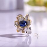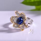 Delicate petals outlined in gold & sparkle with a striking blue stone at the heart.