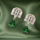 Zirconia & baguettes framing emerald green stones at the centre and a emerald teardrop dangling for extra sparkle.