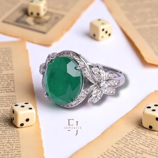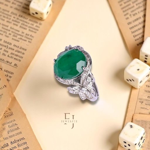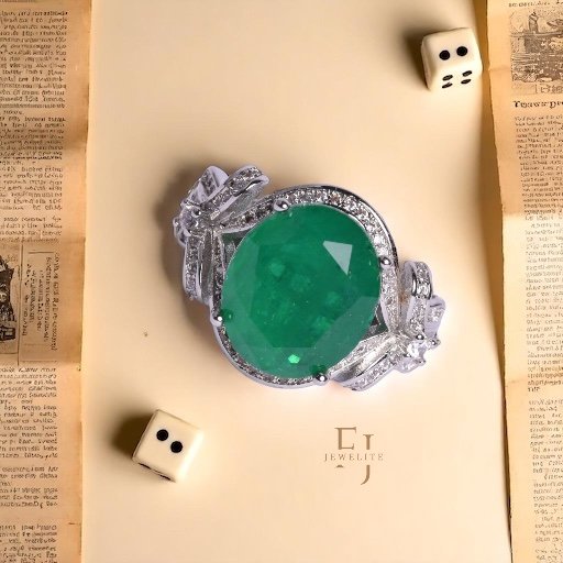 Exquisite statement ring features a magnificent local cut emerald centre stone, radiating a rich forest green hue. The stone is cradled in a shimmering halo of pave-set crystals, leading into an intricate, handcrafted bow motif on the shoulders.